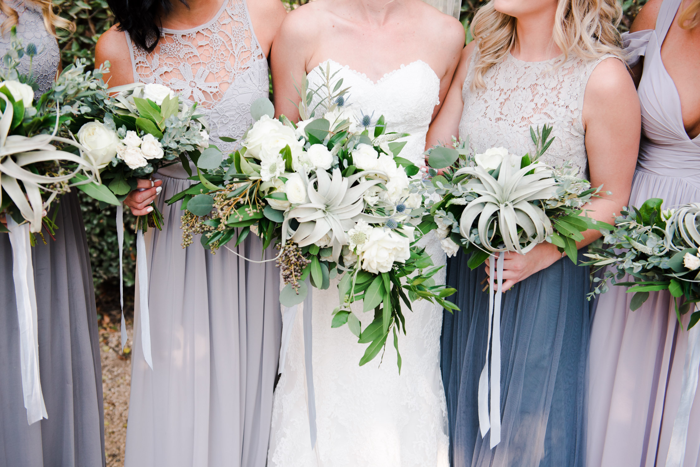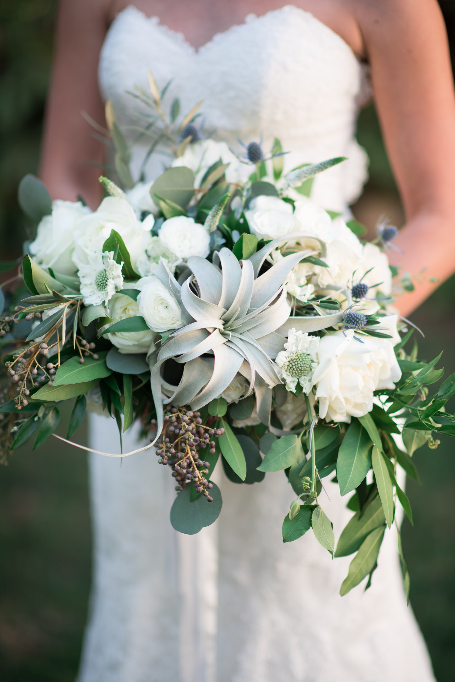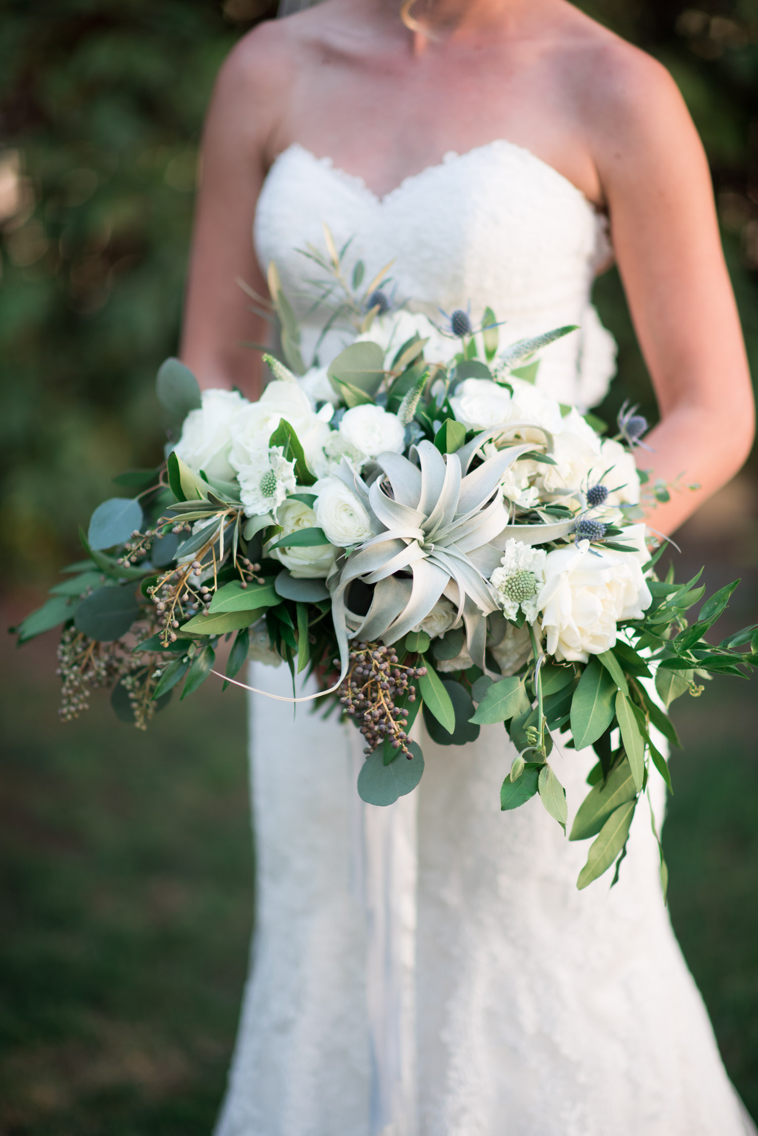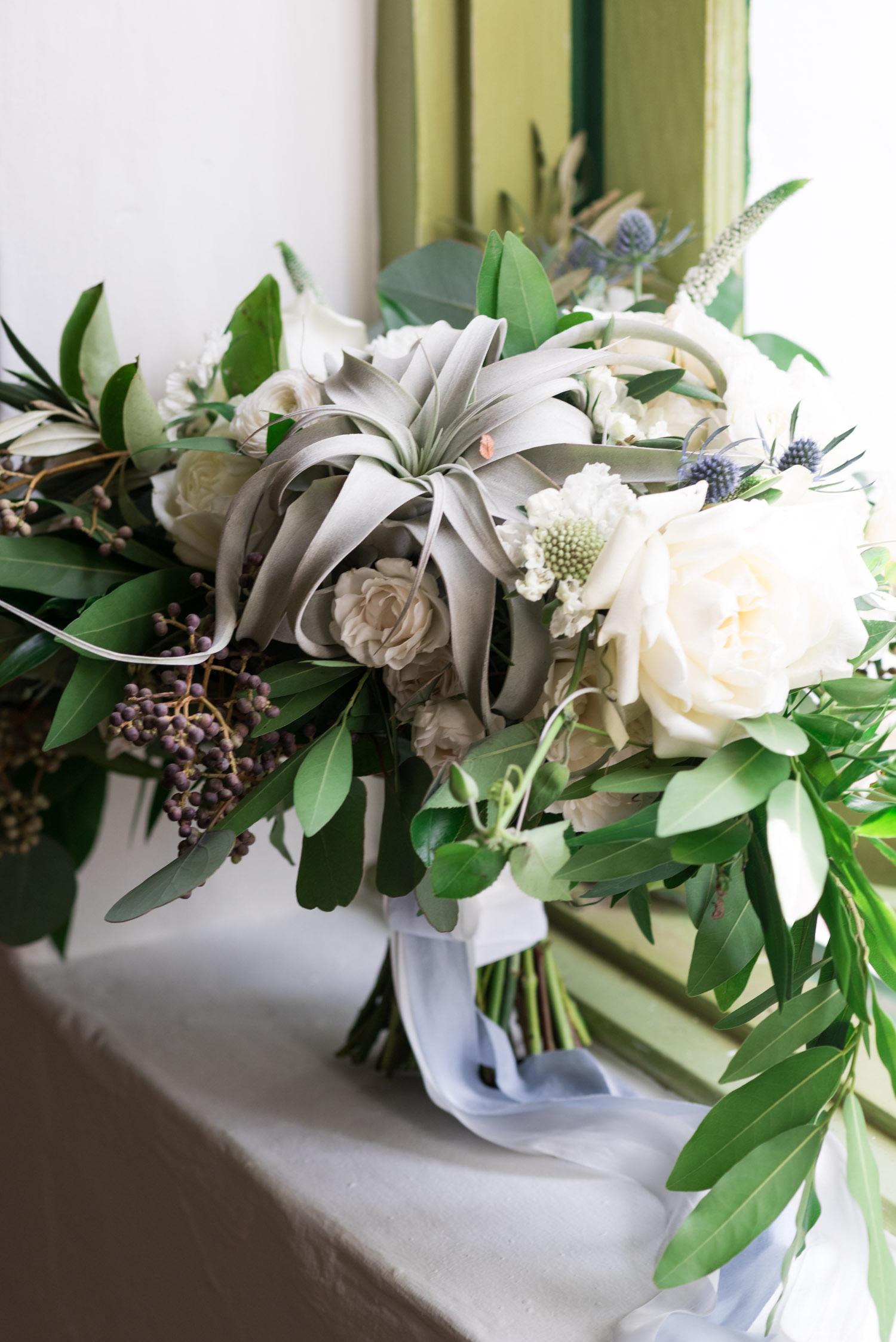 These bouquets were made up of a lush mix of greenery, air plants, polo roses, blue thistle and privet berry. This color combo when great with the dusty blue bridesmaids dresses. Hand dyed silk ribbons made by me! Photography by my hubby Craig Reynolds Photography!