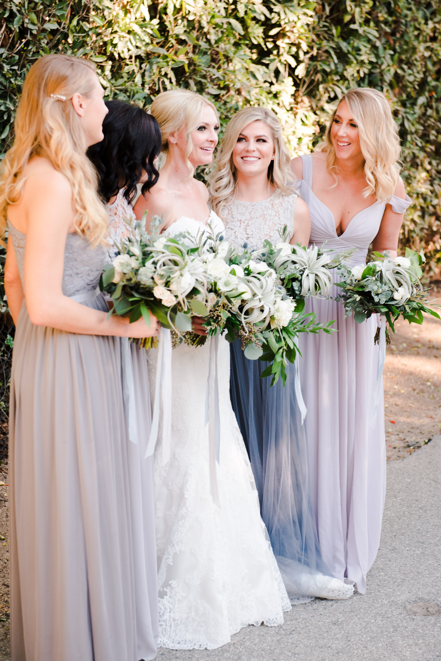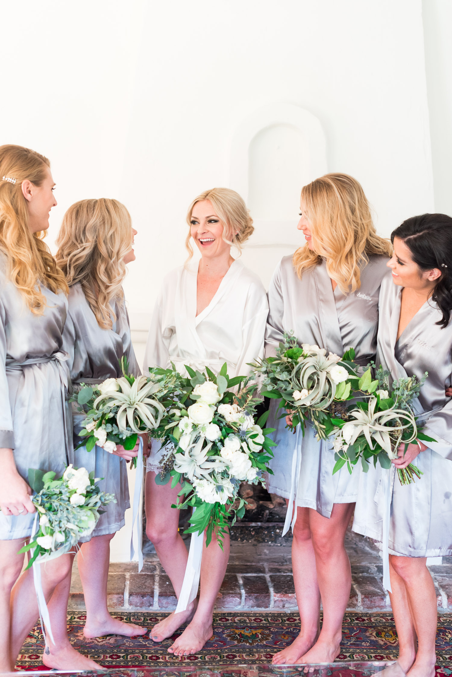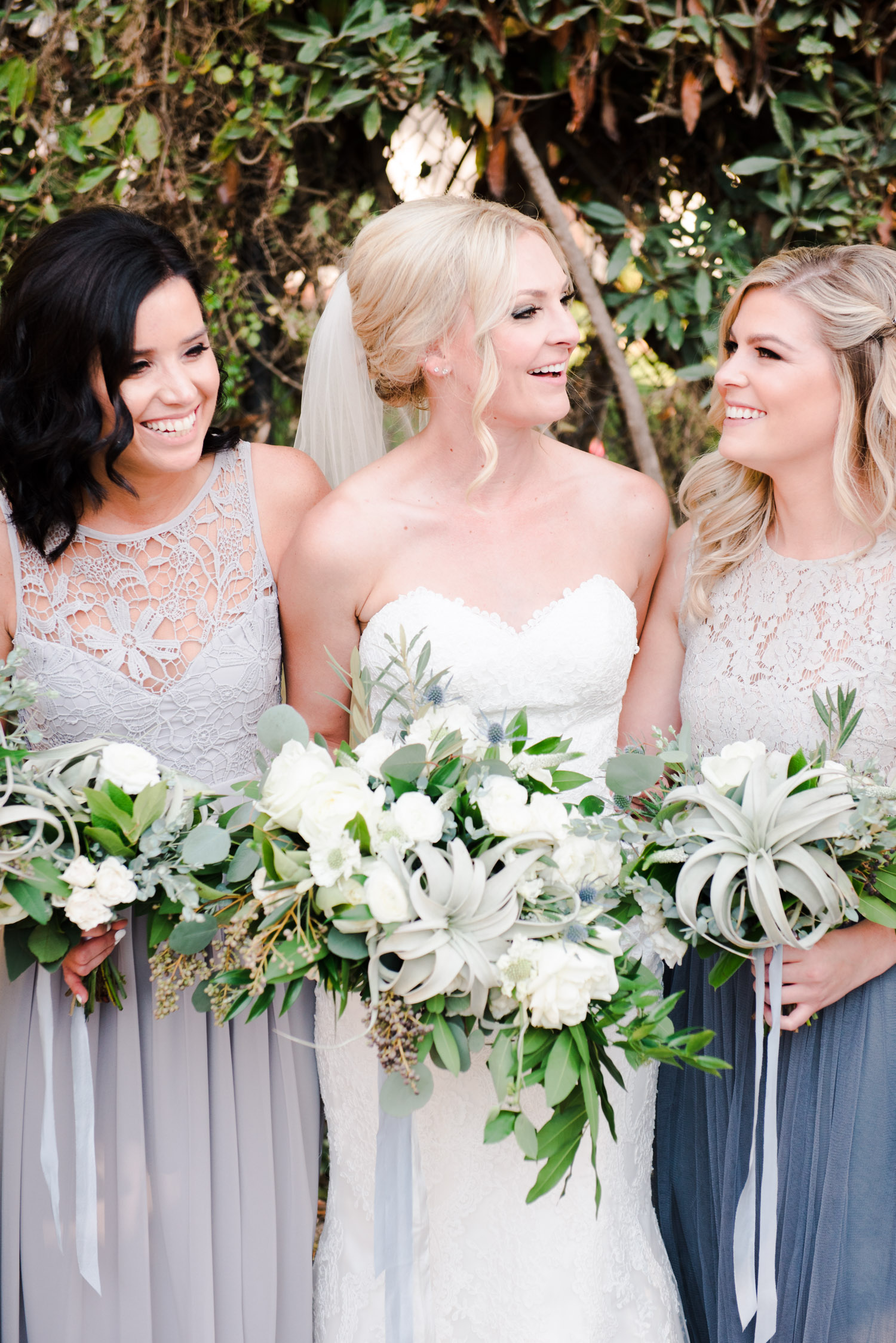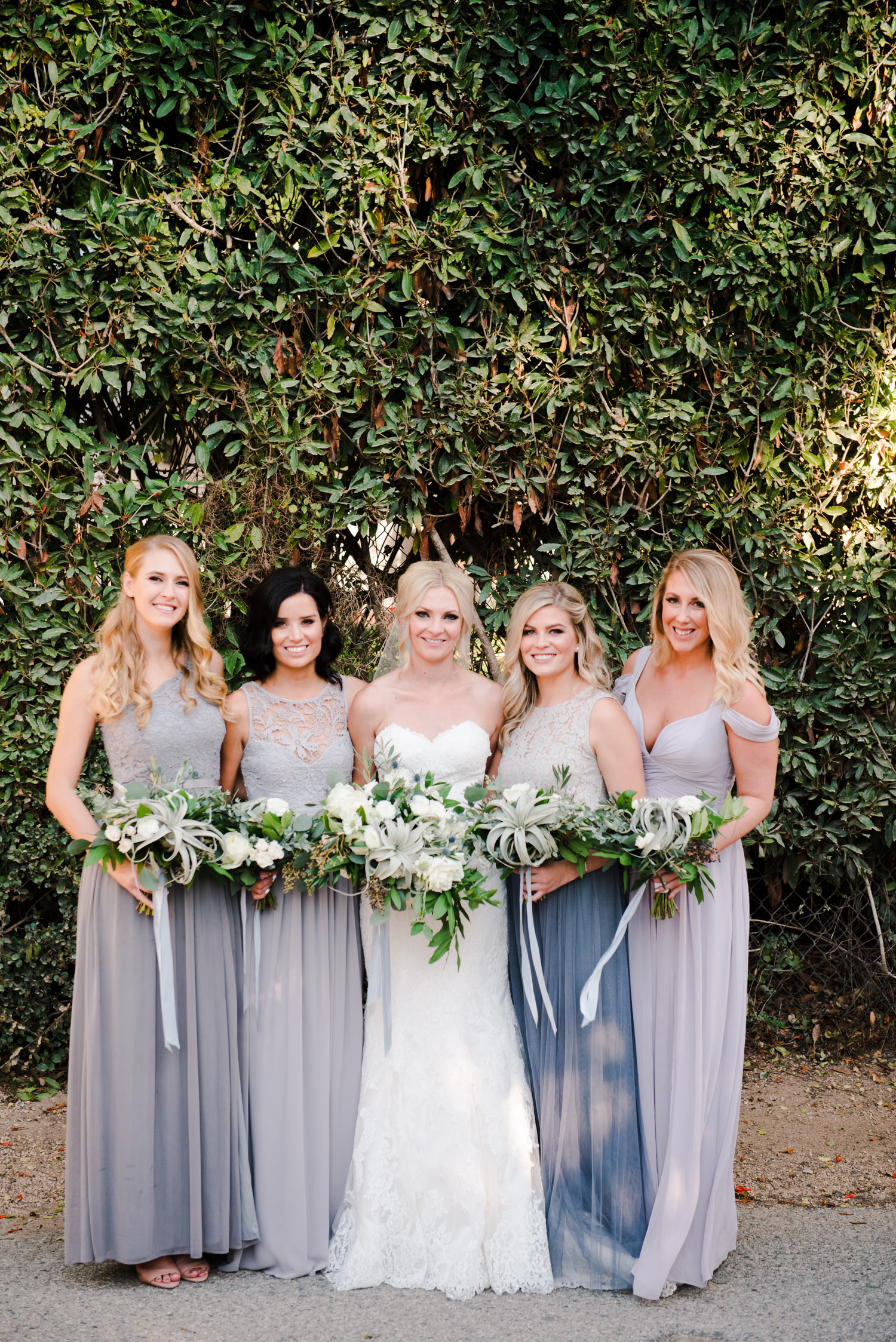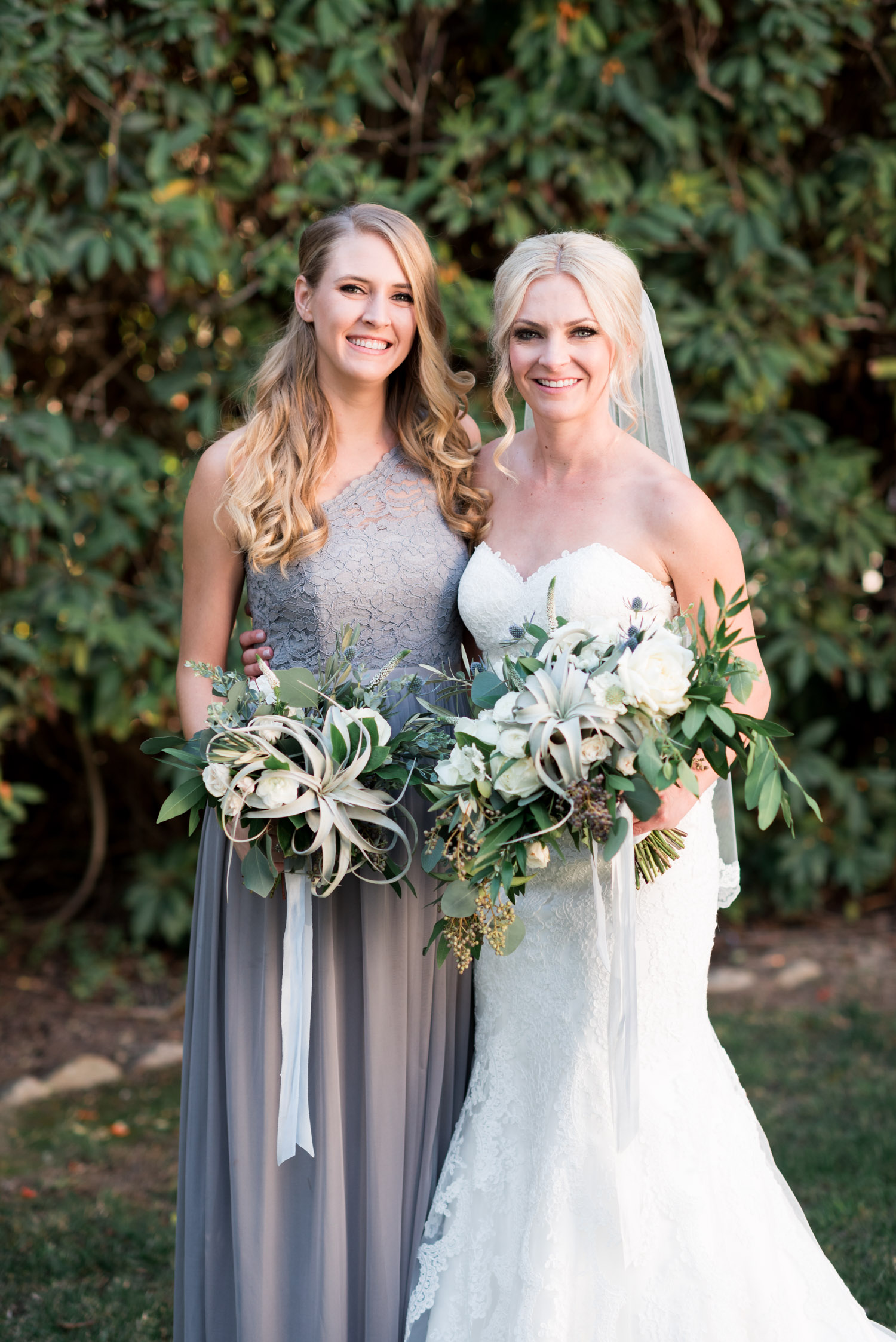 These bouquets were made up of a lush mix of greenery, air plants, polo roses, blue thistle and privet berry. This color combo when great with the dusty blue bridesmaids dresses. Hand dyed silk ribbons made by me! Photography by my hubby Craig Reynolds Photography!