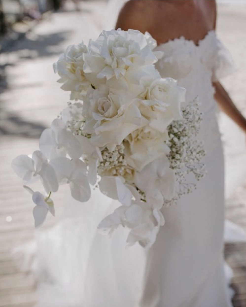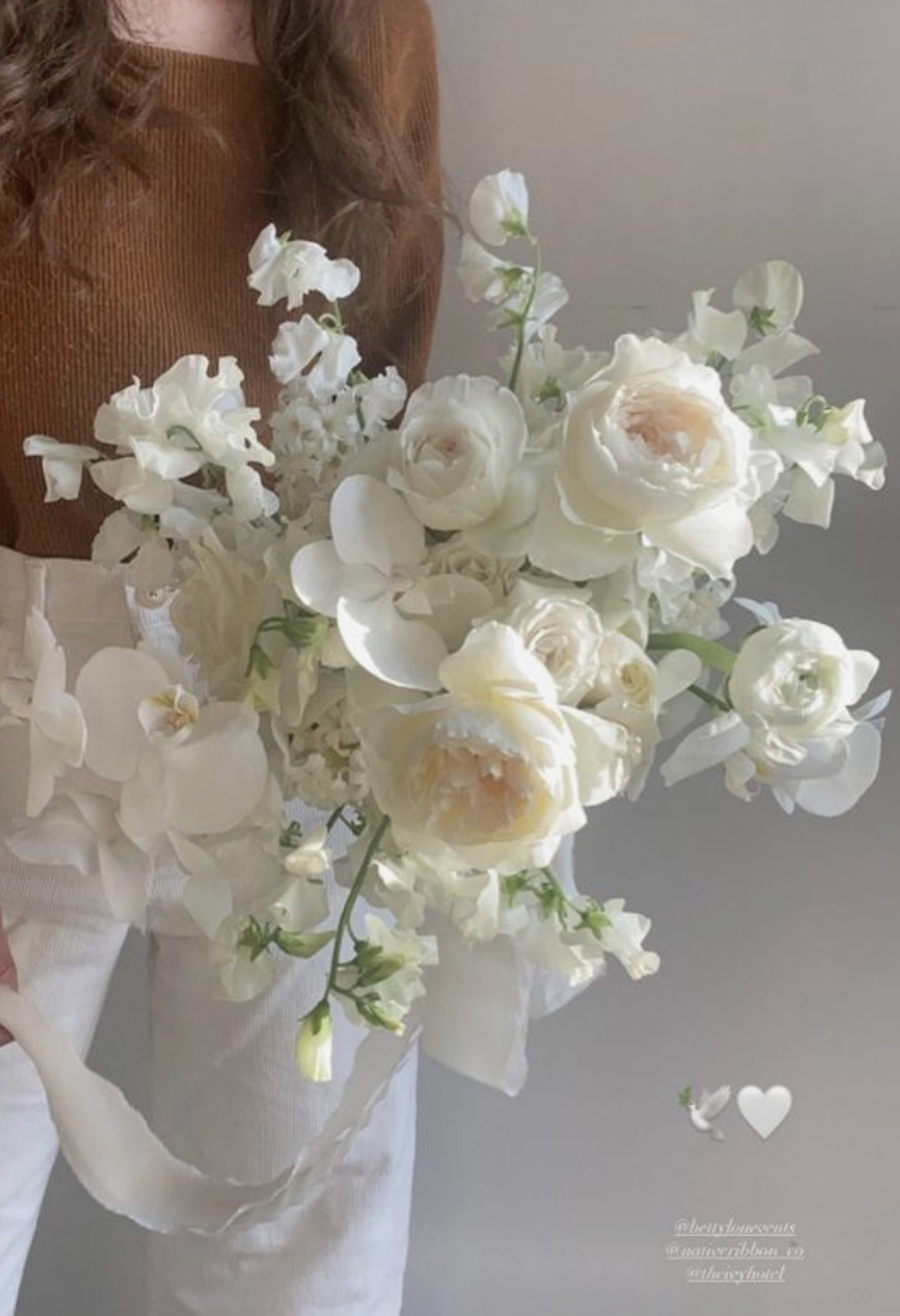 Big bouquet for bride: white roses, orchid, ranunculus, baby’s breath, and sweet peas. Wrapped in white ribbon.