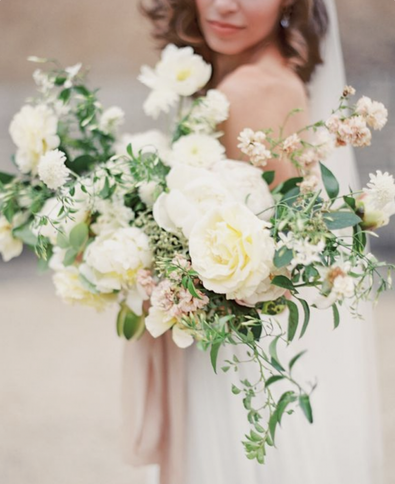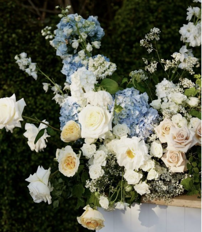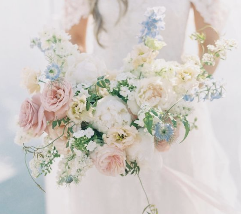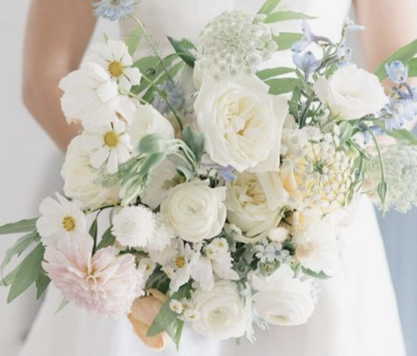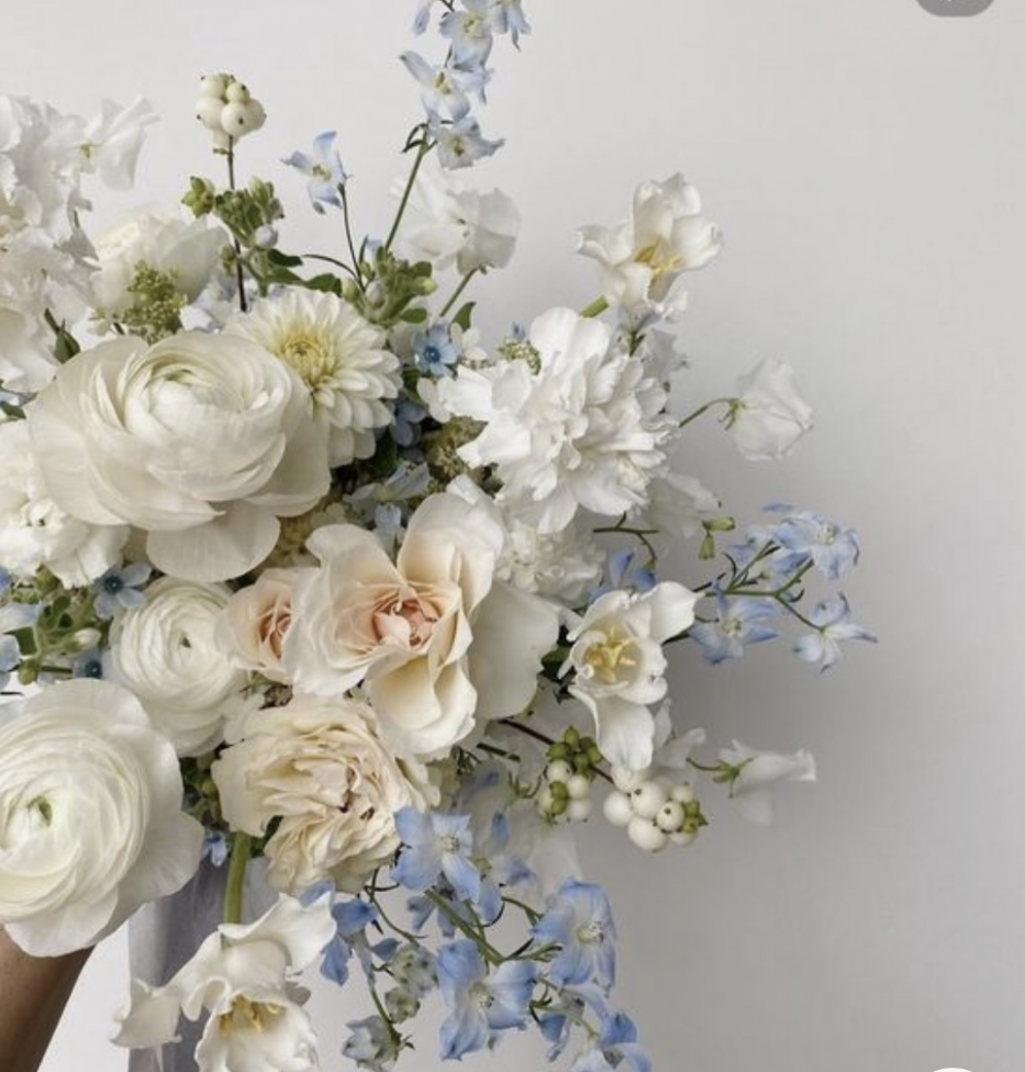 A medium sized lush handtied bouquet of white garden roses, white spirea, light blue delphinium, jasmine vine, white sweetpeas, butter yellow stock, blush garden roses, white ranunculus. Light blue silk ribbon.