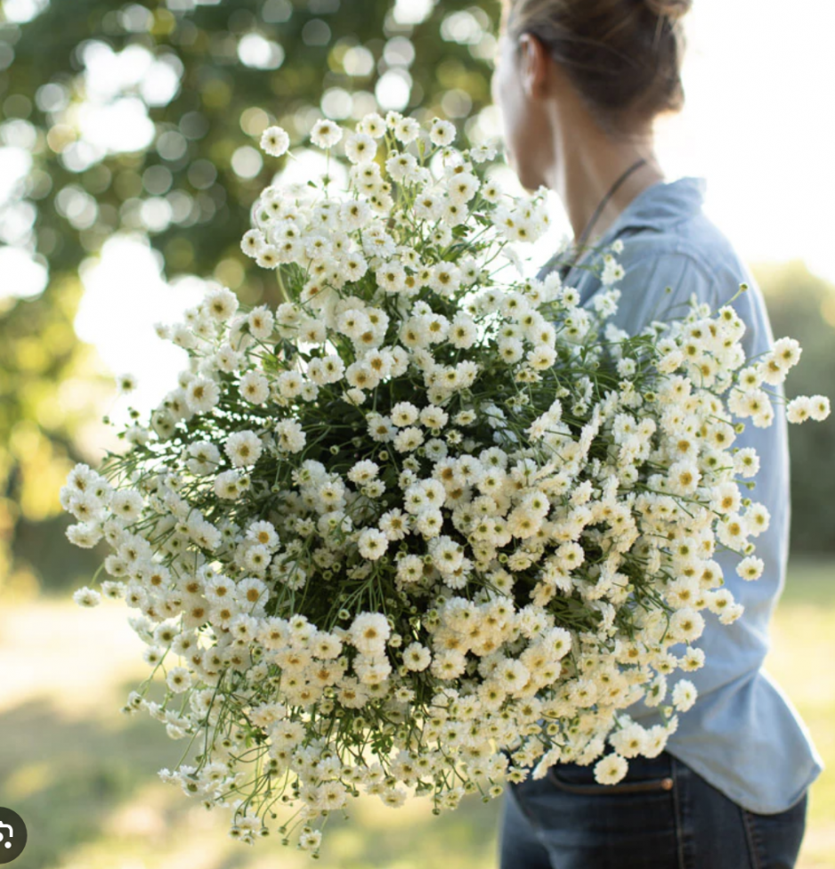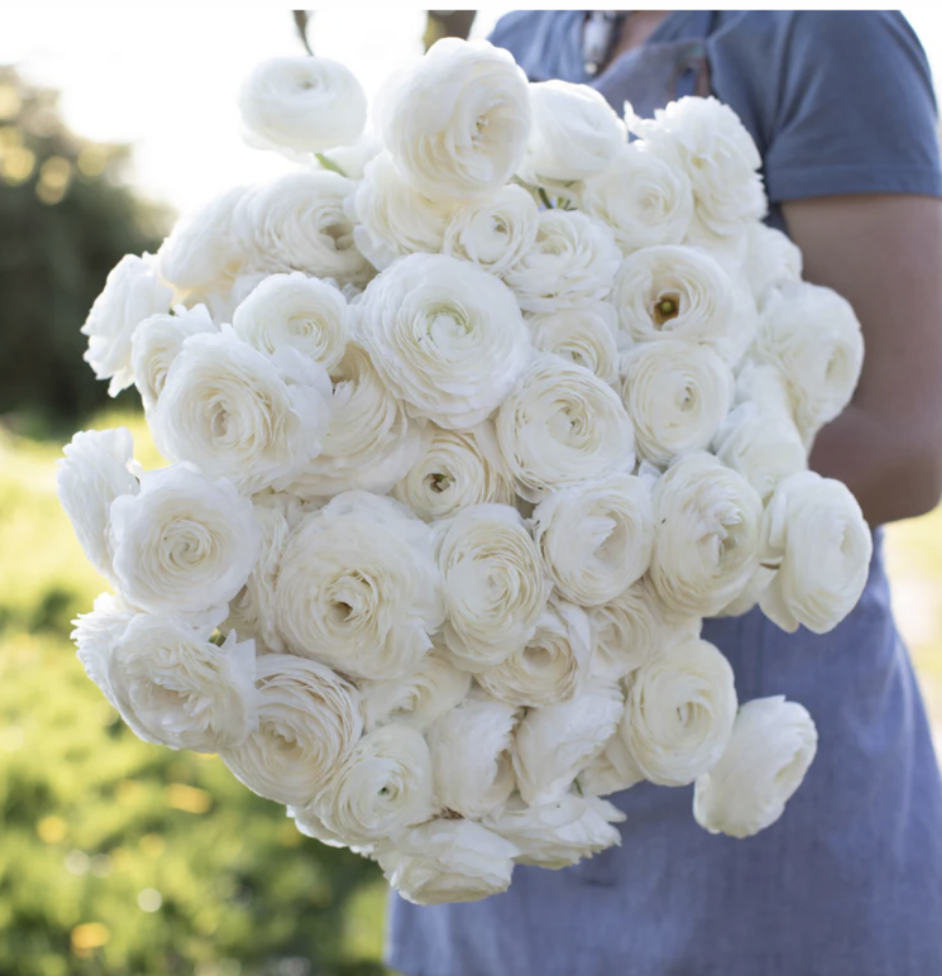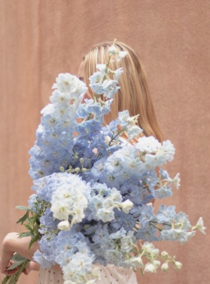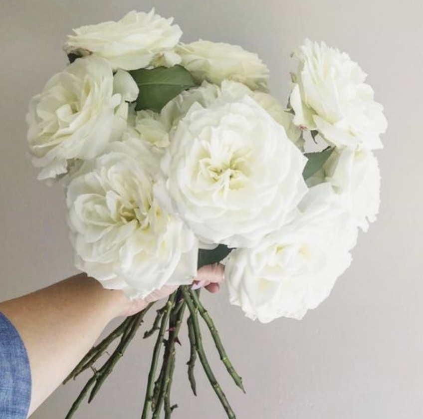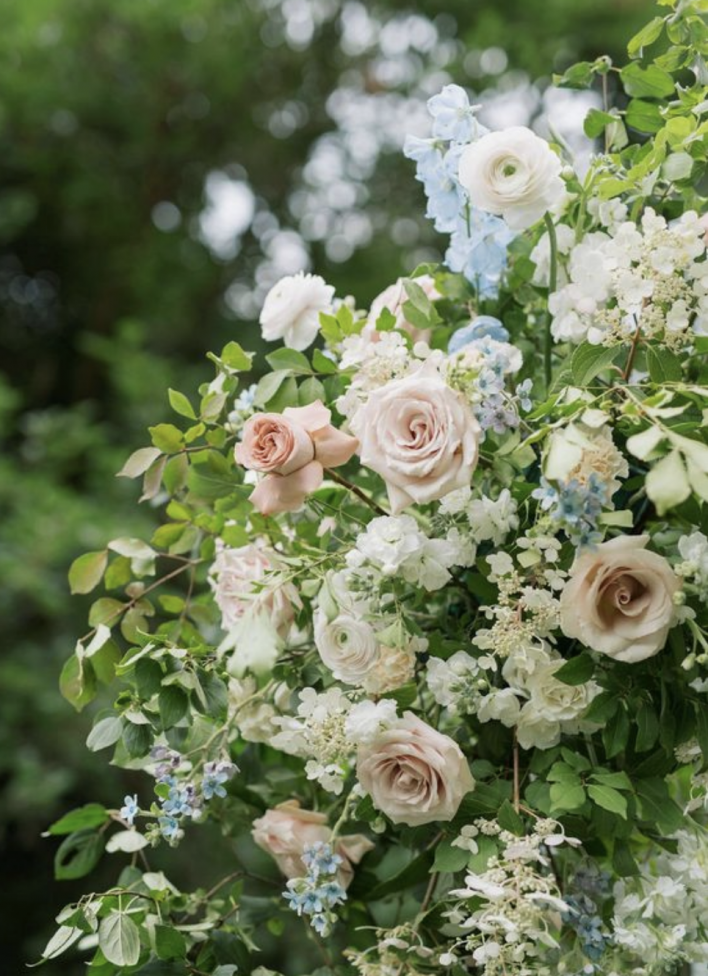 A medium sized lush handtied bouquet of white garden roses, white spirea, light blue delphinium, jasmine vine, white sweetpeas, butter yellow stock, blush garden roses, white ranunculus. Light blue silk ribbon.