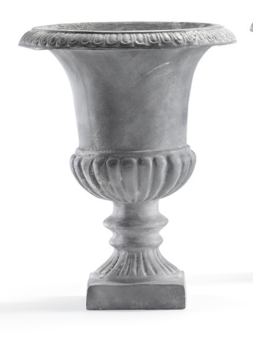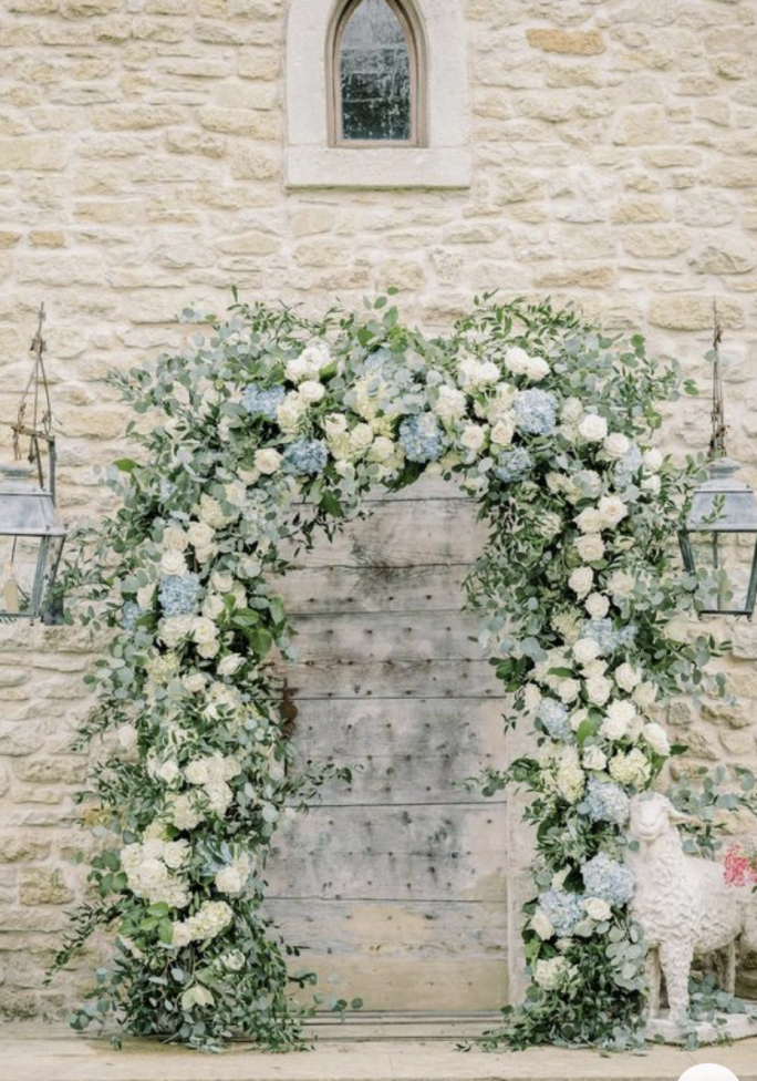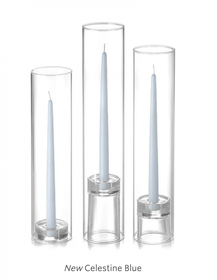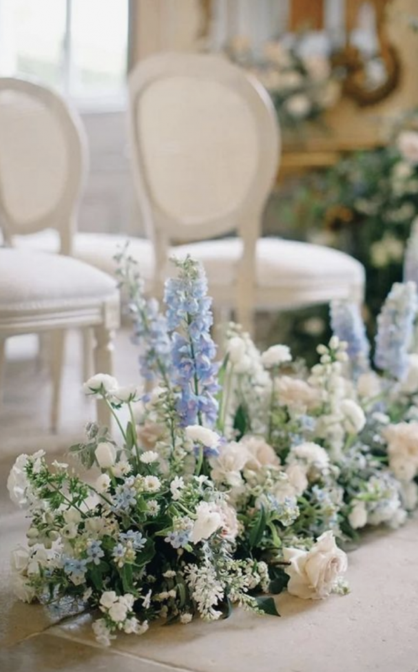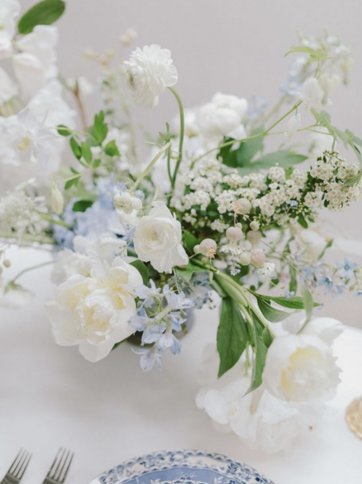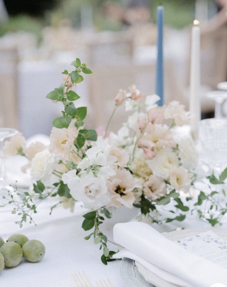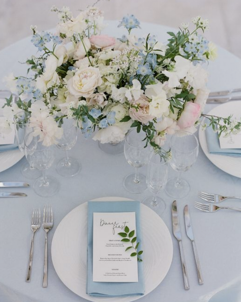 Centerpiece: grey urn with artfully arranged flowers mostly white and green with pops of light blue, light blush and butter yellow. Trio of Soft blue taper candles in clear glass holder