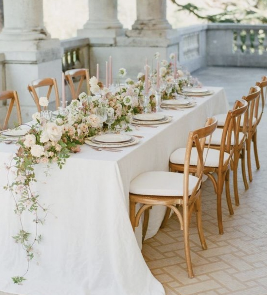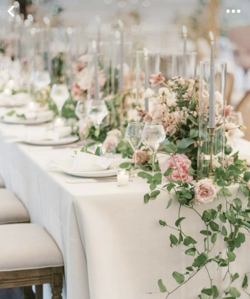 Sweetheart table: Floral runner down the middle of table with delicate green vines cascading off the edges. Using same flowers and candles as centerpieces.