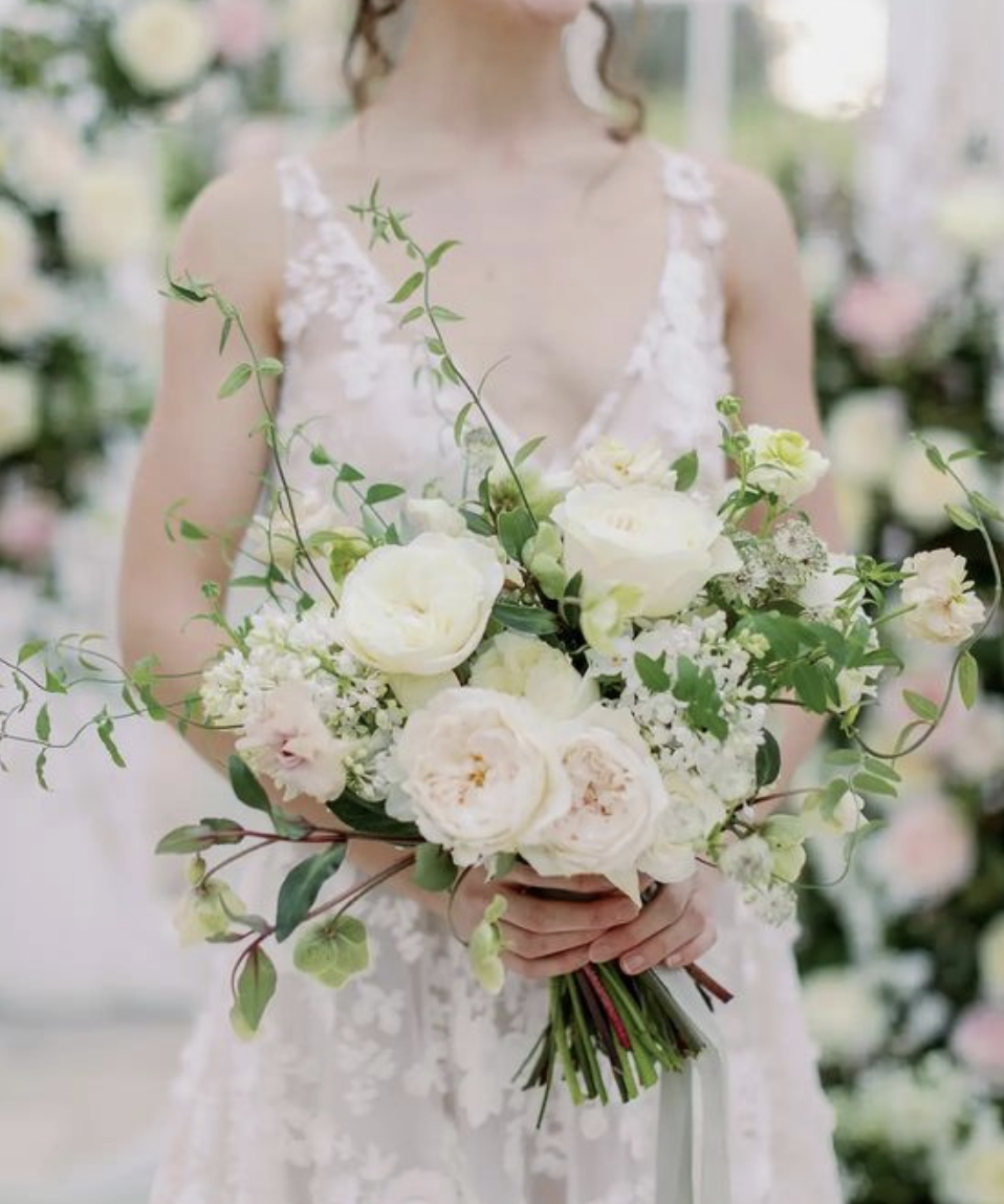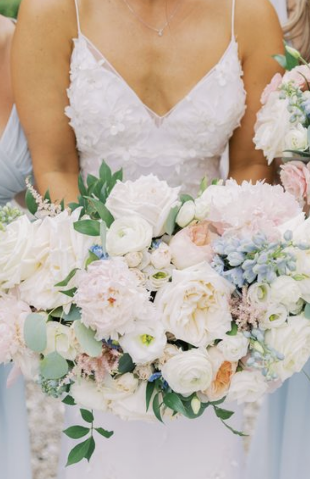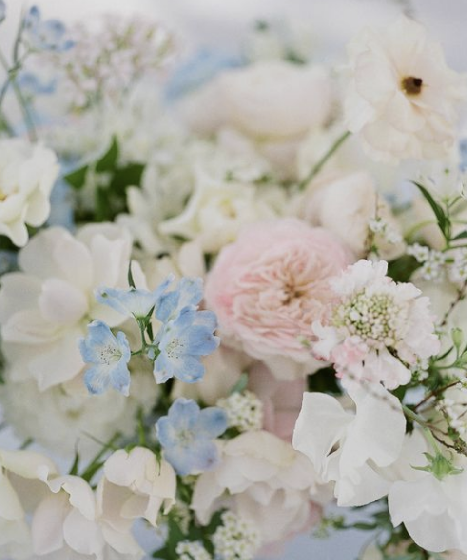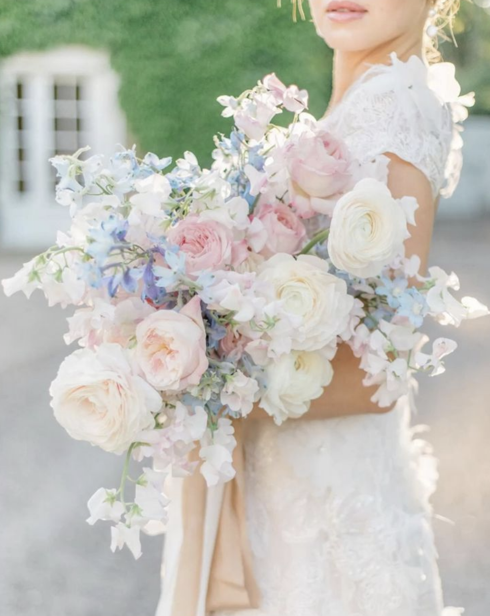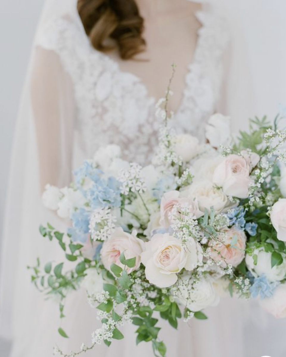 A medium sized lush handtied bouquet of white garden roses, white spirea, light blue delphinium, jasmine vine, white sweetpeas, butter yellow stock, blush garden roses, white ranunculus. Light blue silk ribbon.