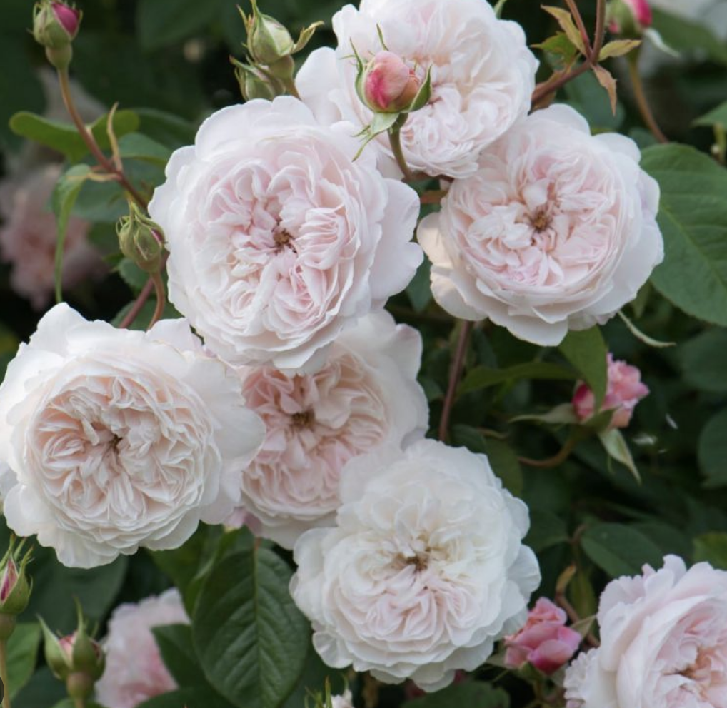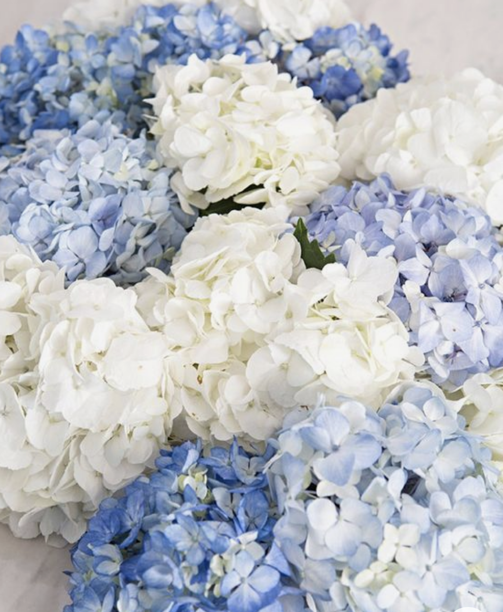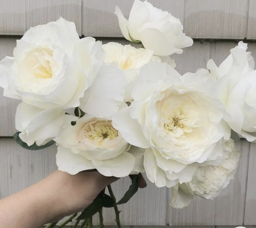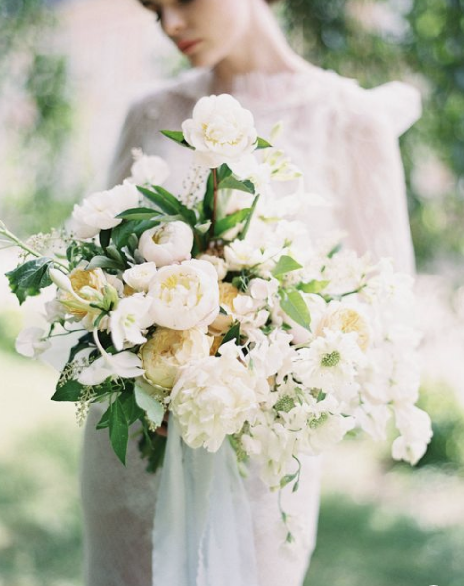 A medium sized lush handtied bouquet of white garden roses, white spirea, light blue delphinium, jasmine vine, white sweetpeas, butter yellow stock, blush garden roses, white ranunculus. Light blue silk ribbon.