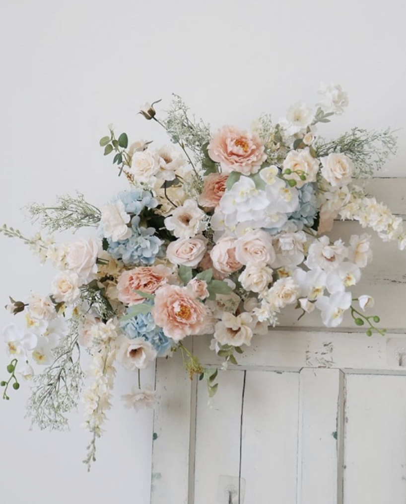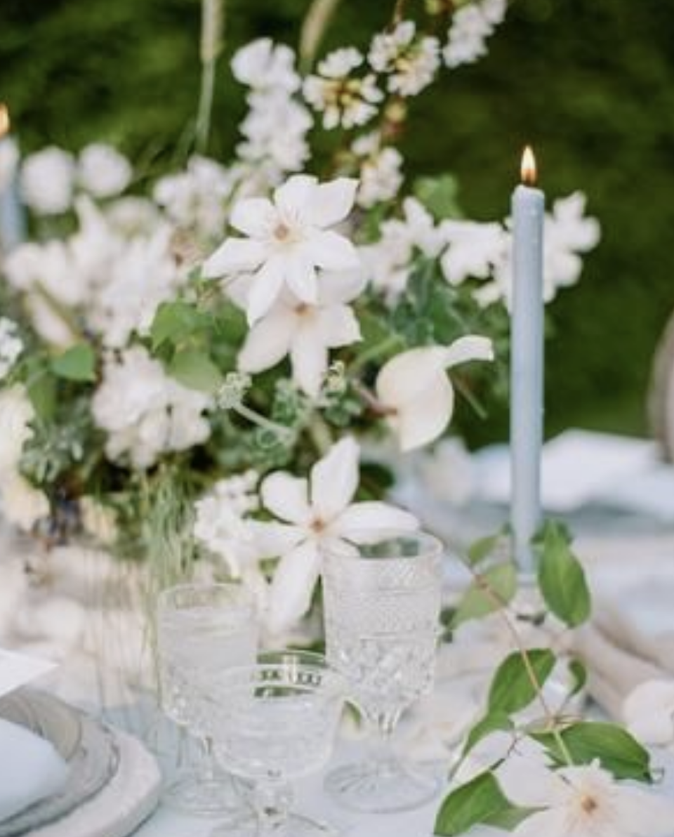 Centerpiece: grey urn with artfully arranged flowers mostly white and green with pops of light blue, light blush and butter yellow. Trio of Soft blue taper candles in clear glass holder
