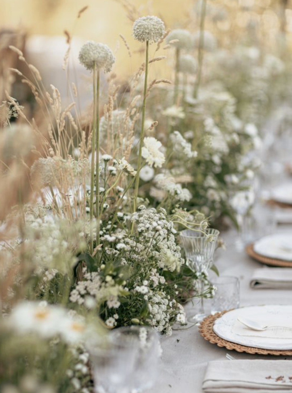 Sweetheart table: Floral runner down the middle of table with delicate green vines cascading off the edges. Using same flowers and candles as centerpieces.