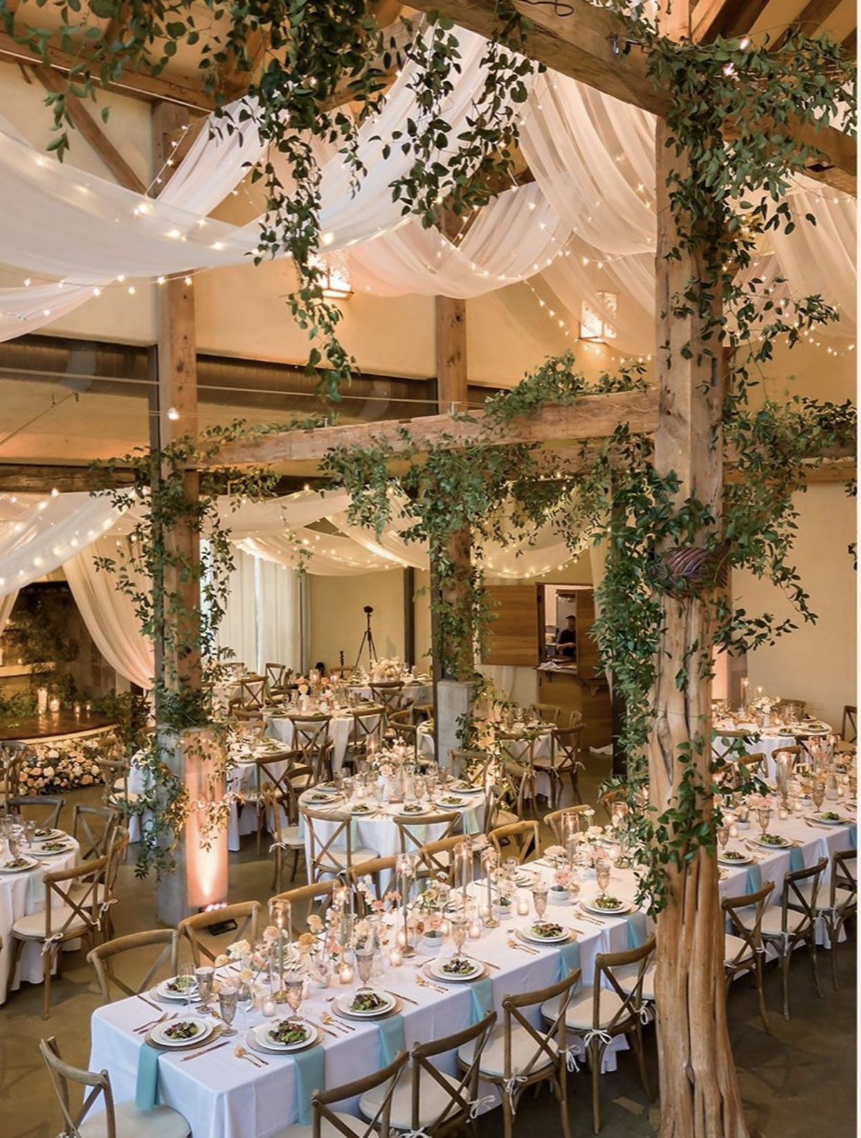 Rafters: Smilax Greenery dangling from the rafters throughout the reception space.