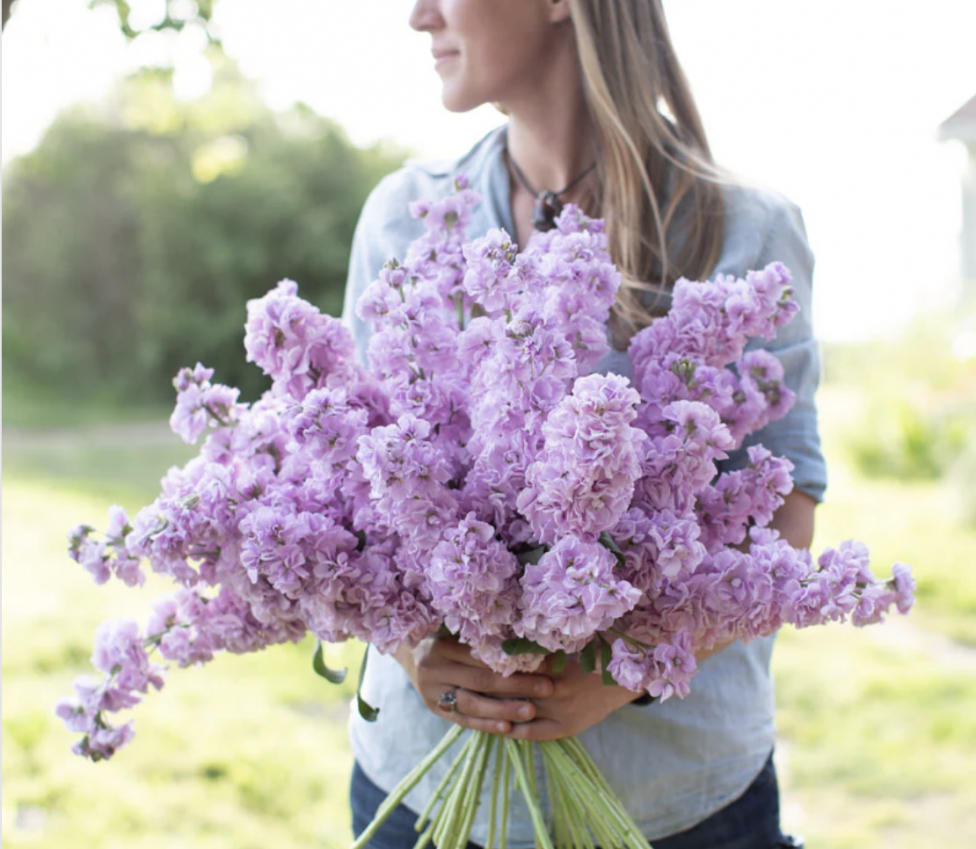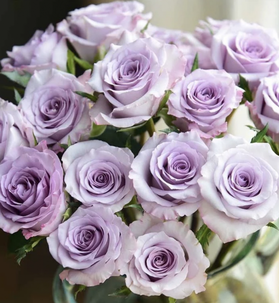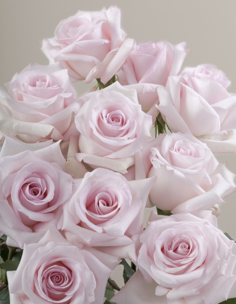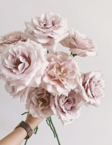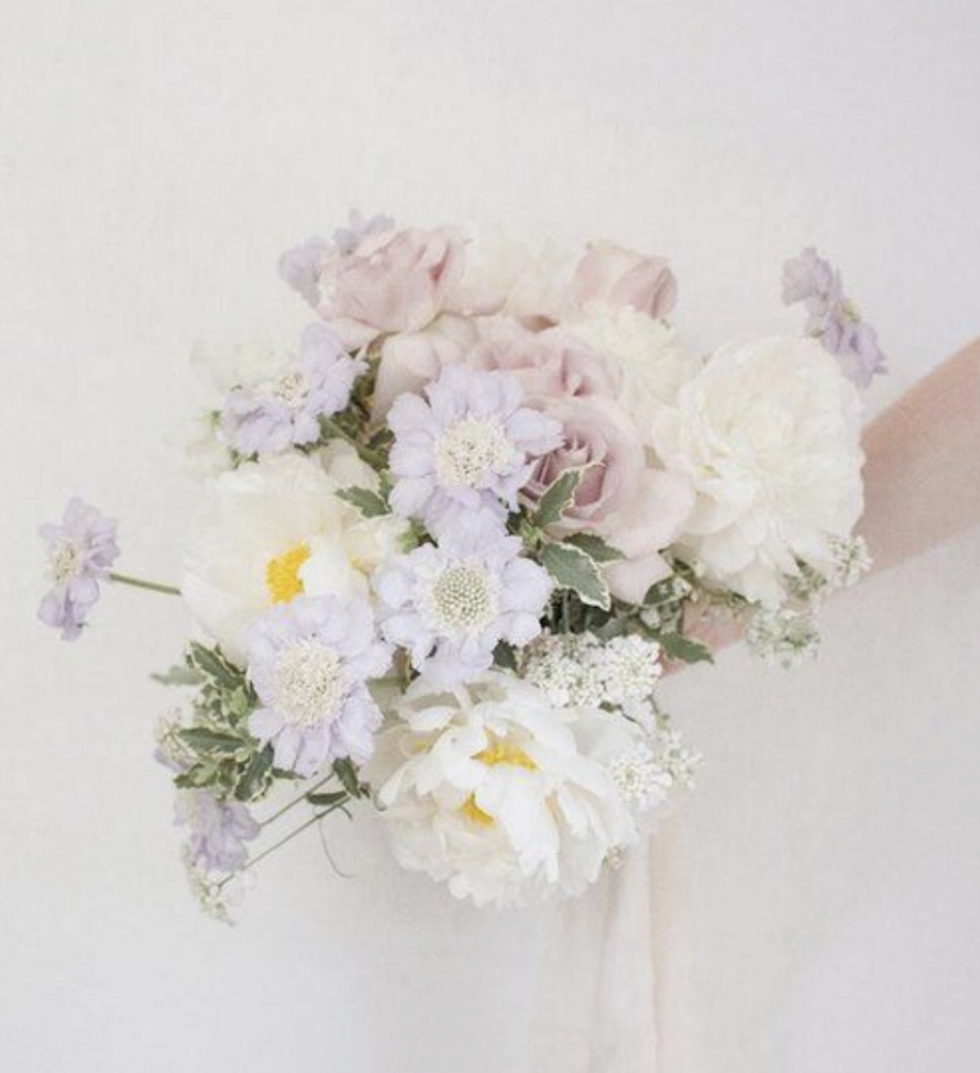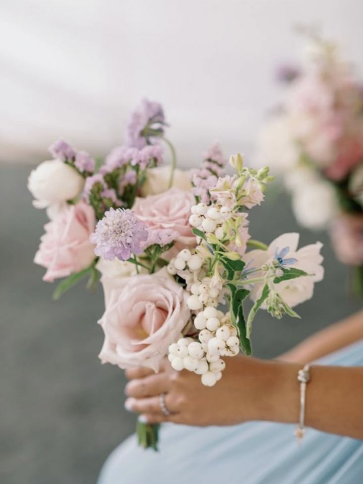 Bridal Bouquet: Hand-tied bouquet of light pink roses, lavender stock, Ivory Spray roses mixed eucalyptus greenery.