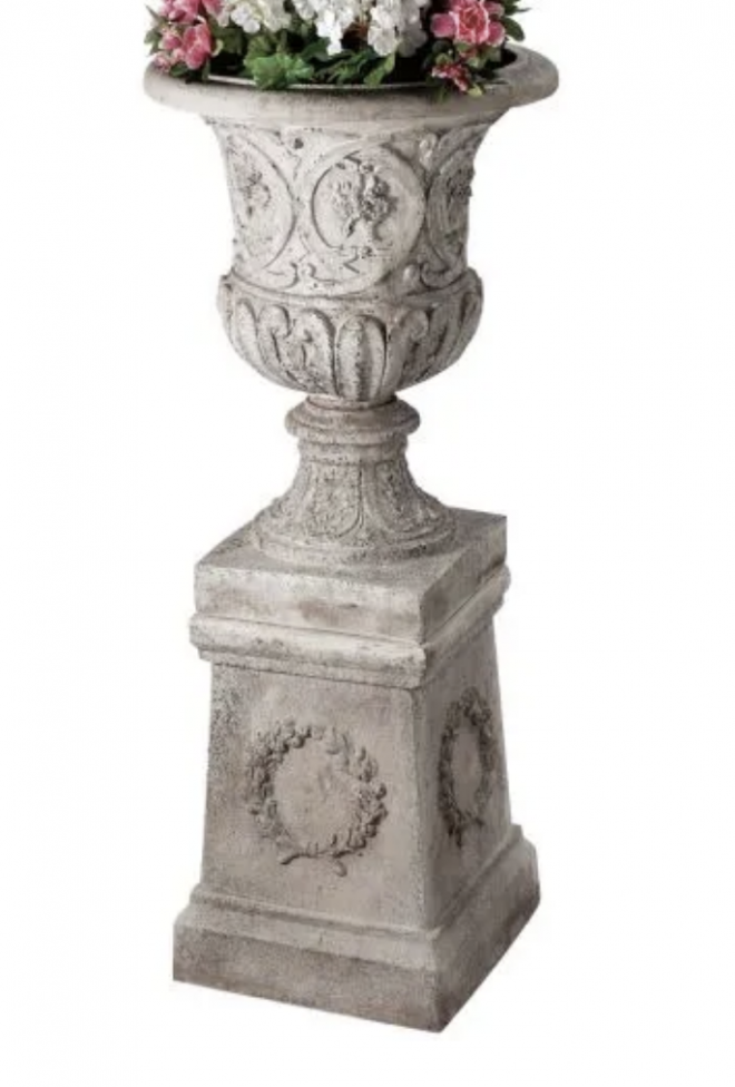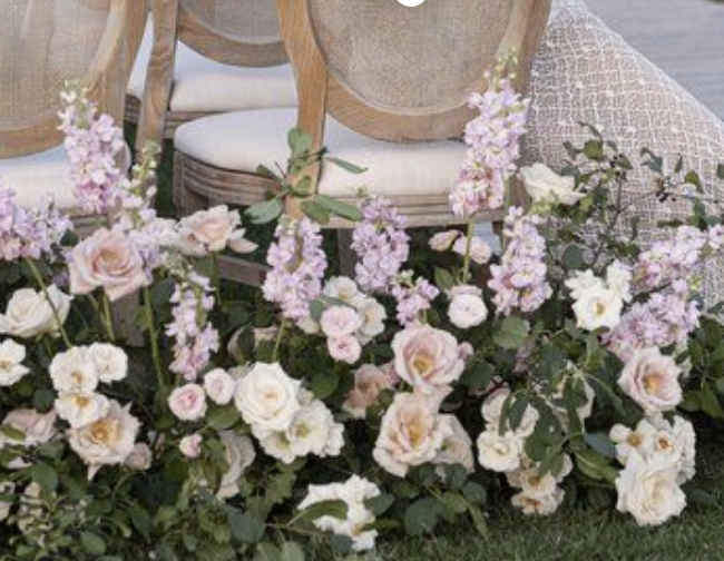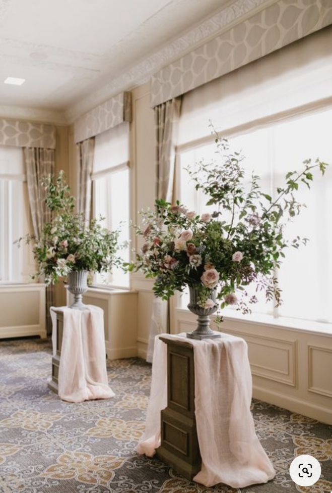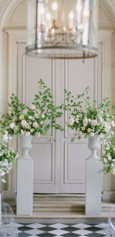 Two sets of pillars and urns on each side ( 2 medium height) Seasonal florals (no hydrangeas or delphinium outside due to heat) Roses, mixed eucalyptus greenery.