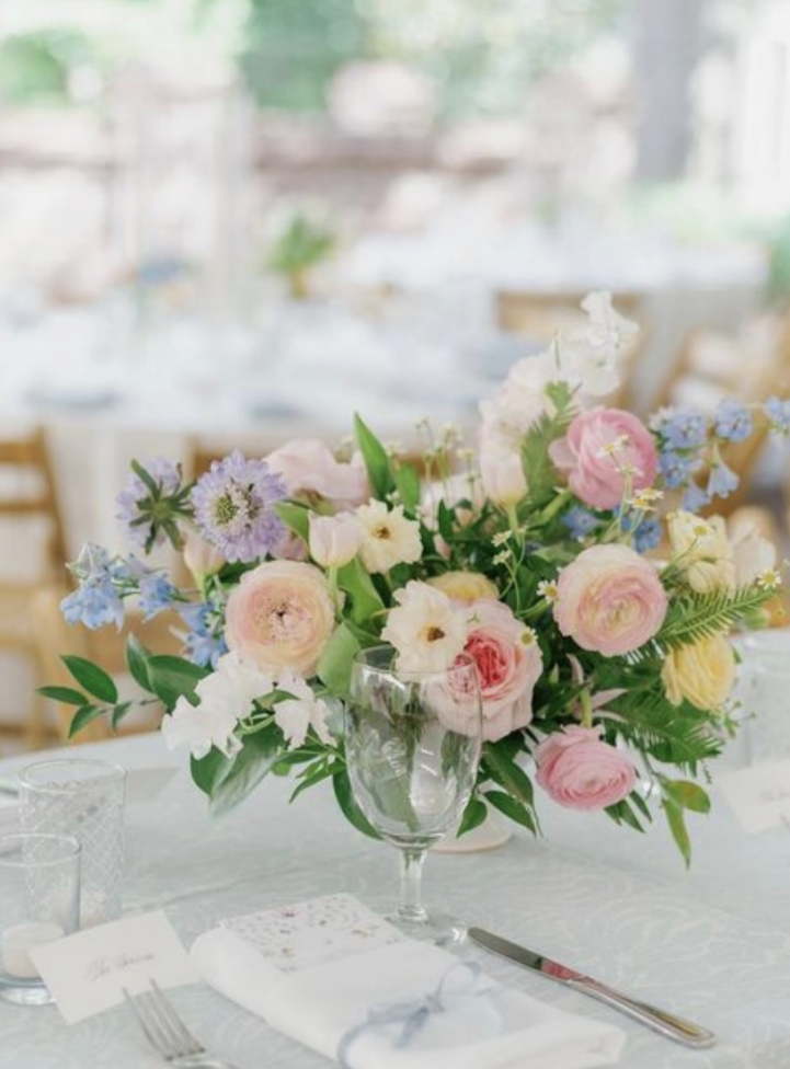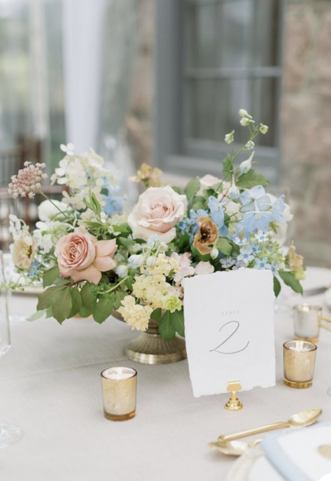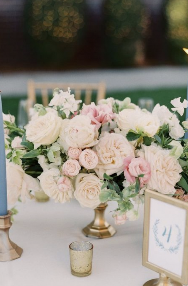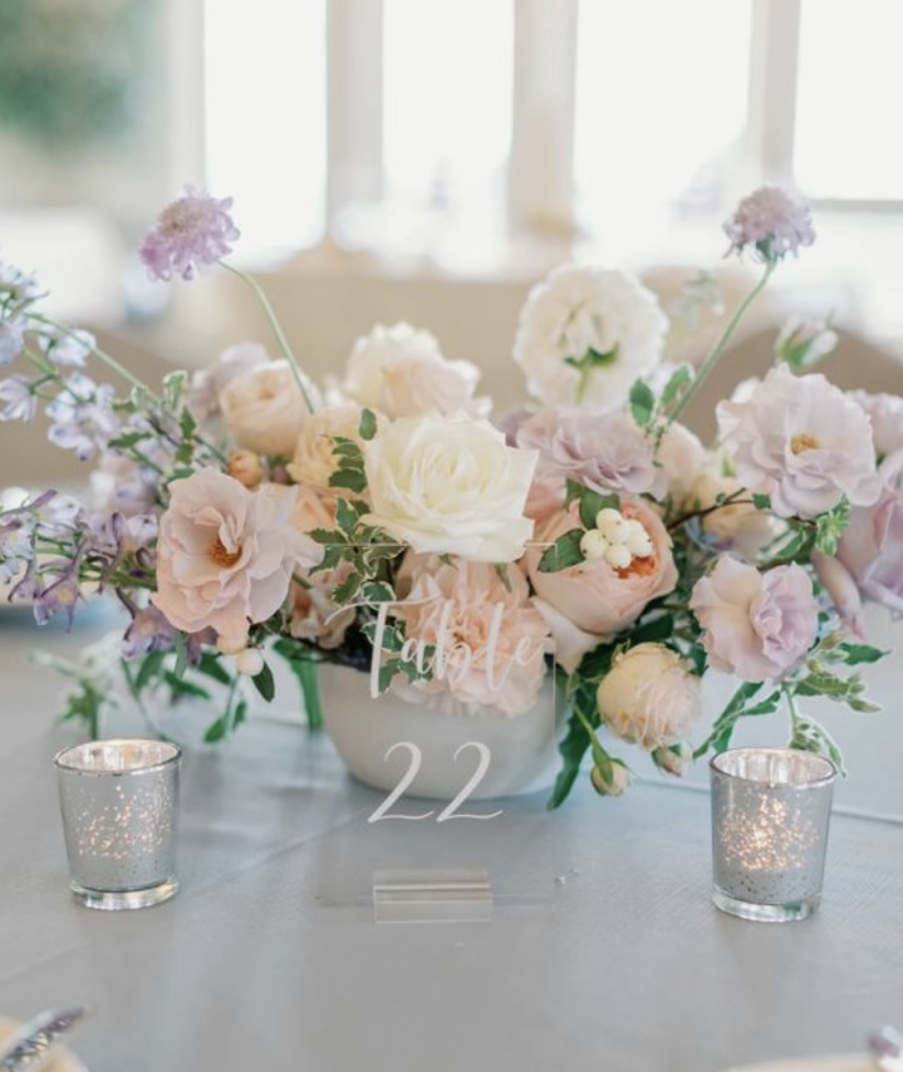 Low, medium centerpieces with seasonal pastel flowers including white and light blue hydrangeas, light pink, lavender roses, lavender and blush stock, with mixed eucalyptus greenery.