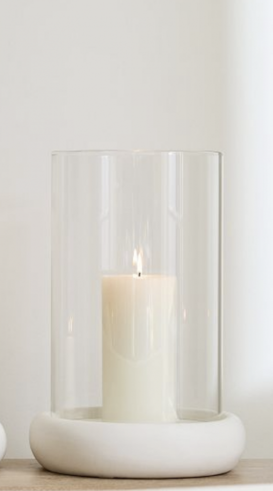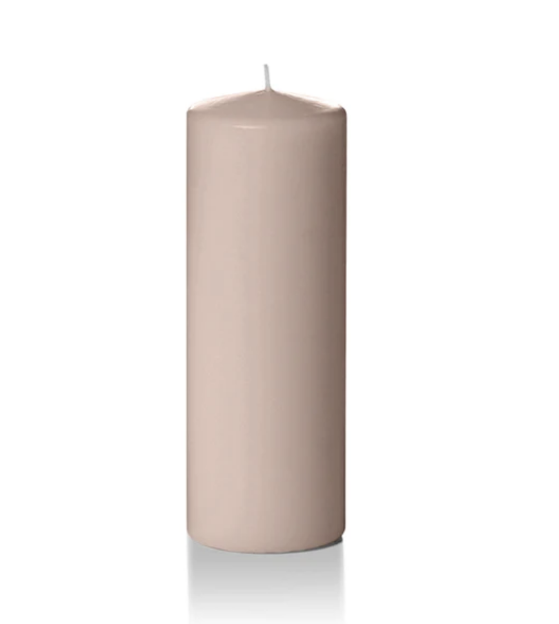 4 tall glass chandeliers for 3 kings tables put together; a mixture of every other large white ceramic compote and small ceramic compote down the length of the long table; Yummi candles in Desert Rose; tapers for the chandeliers; and 8” tall pillar candles with white ceramic base covered by hurricane glass.