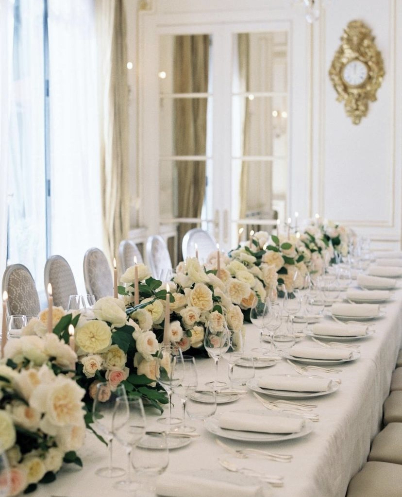 A long, lush row of low to medium centerpieces that extend the length of a long table. (minimal greenery)